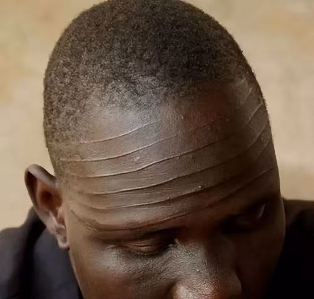 這是丁卡族每個男孩在成人禮的時候需要經歷的一道過程,通過鋒利的刀子劃出六道橫線,用這種殘忍的方式鍛鍊男子堅韌的意志和好戰的性格。