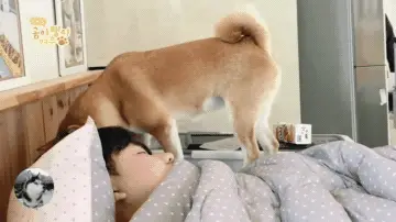 狗狗成為了「鬧鐘」,有段時間柴犬會很早叫醒主人,甚至天剛亮就起來,然後它們「不擇手段」讓鏟屎官起床,比如踩在他臉上、舔主人的鼻子、坐在主人的頭上等等。