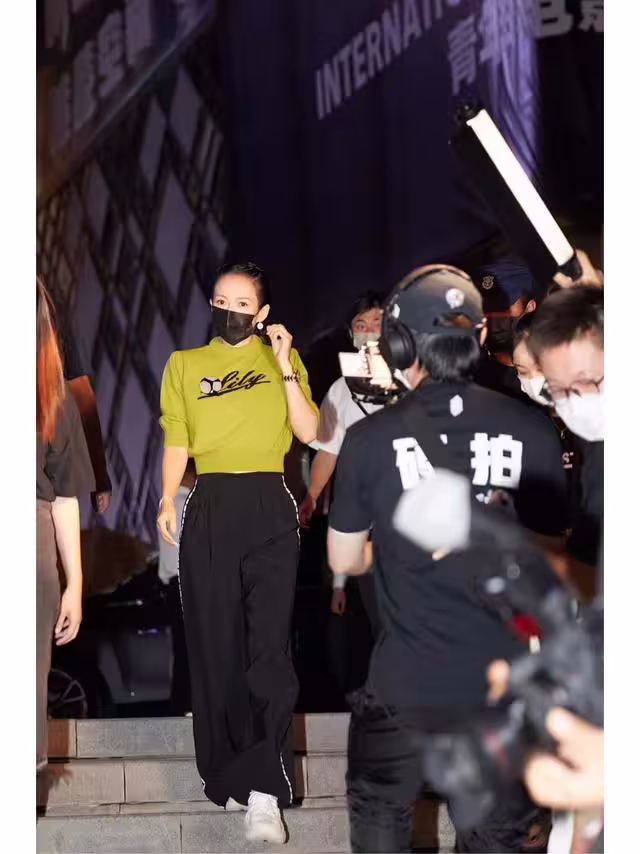 想要搭配的更出彩,可以看看章子怡這一套搭配,上半身穿著亮眼的螢光綠色短款針織衫,短款的設計完美地露出纖細的腰部,拉長腿部線條。螢光綠則提亮了她的膚色,還讓她在人群中脫穎而出,充滿了青春活力。配上黑色闊腿褲,綠與黑的撞色又潮又高級,休閒活力感拉滿~