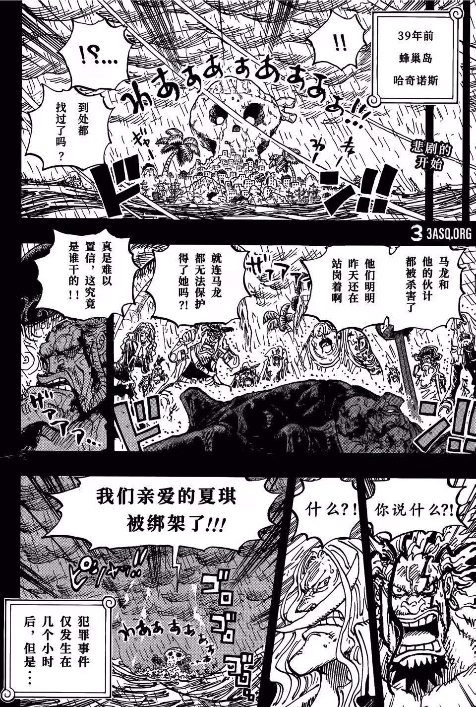 在39年前的神之谷,夏琪失蹤了,洛克斯海賊團正在尋找夏琪,都沒有找到,他們只看到了馬龍的屍體,馬龍站在酒吧前守護夏琪卻被殺死了。這個兇手就是王直,他已經背叛了洛克斯海賊團,一直跟世界政府有利益交易。