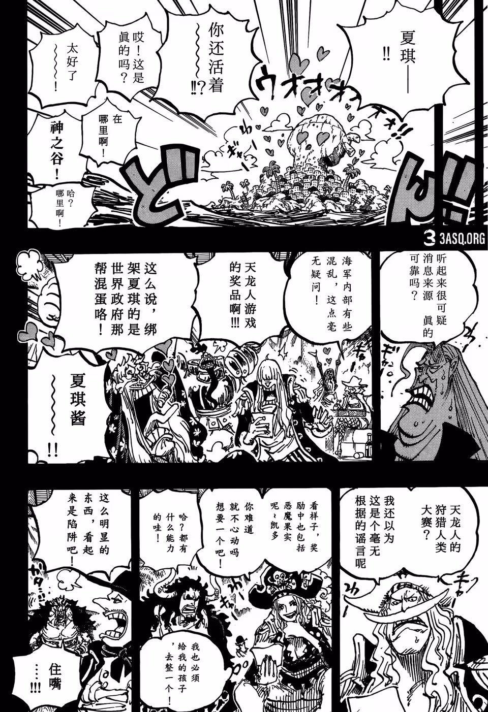 夏琪被綁架了一年時間,洛克斯海賊團才知道夏琪還活著,她就在神之谷。夏琪成為天龍人的獎品,狩獵大賽居然是真實存在的,白鬍子還以為這是傳言,大媽也想去神之谷弄一些惡魔果實給自己的孩子,凱多也想得到一個強大的惡魔果實。