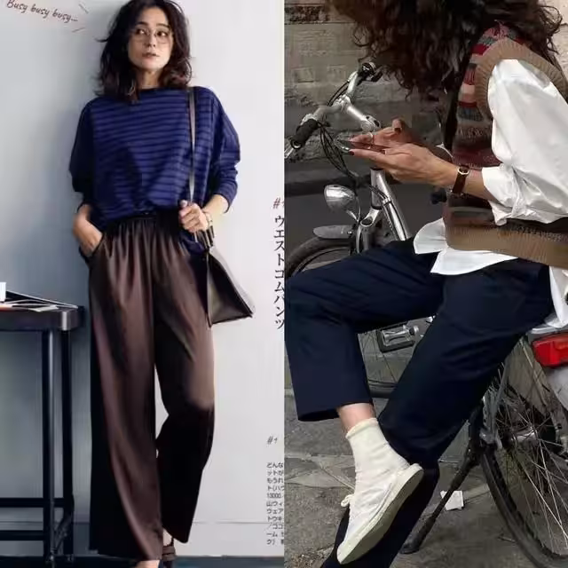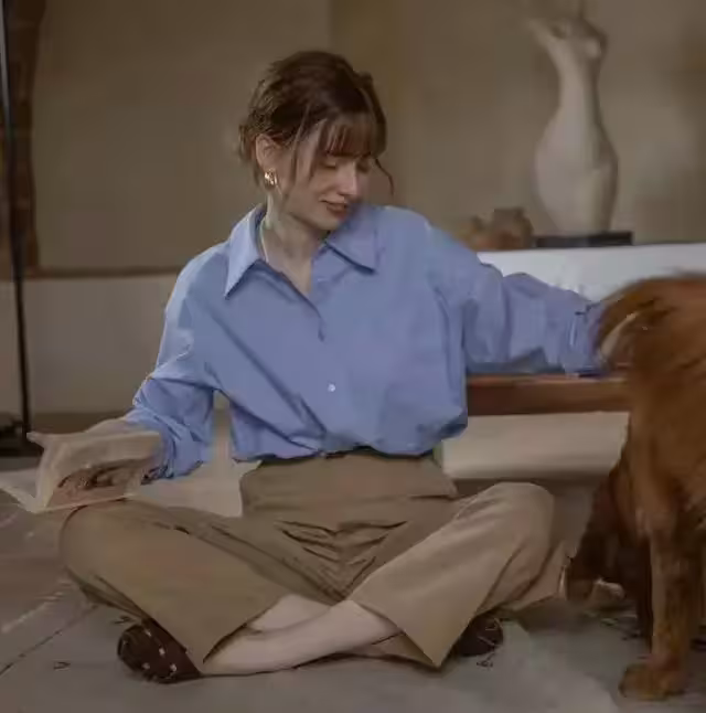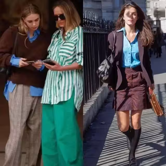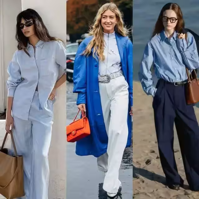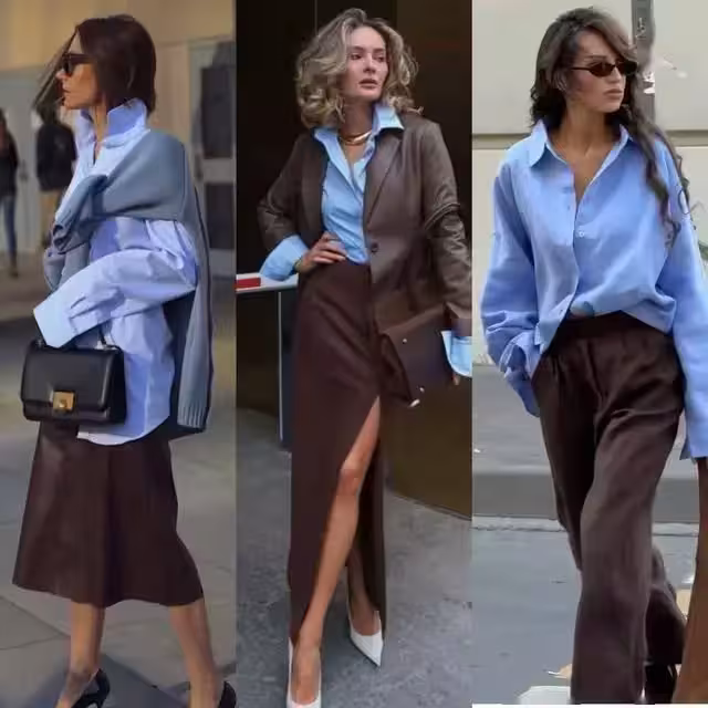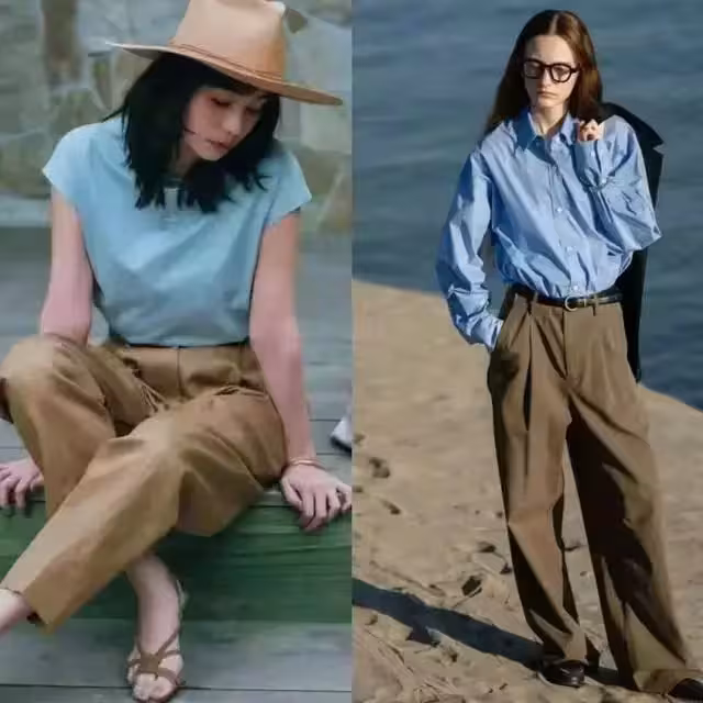 如果你有一條巧克力棕色的闊腿褲,那不妨搭配一件霧霾藍色的襯衫,配色乾淨活潑,又透著高級感,減齡耐看。