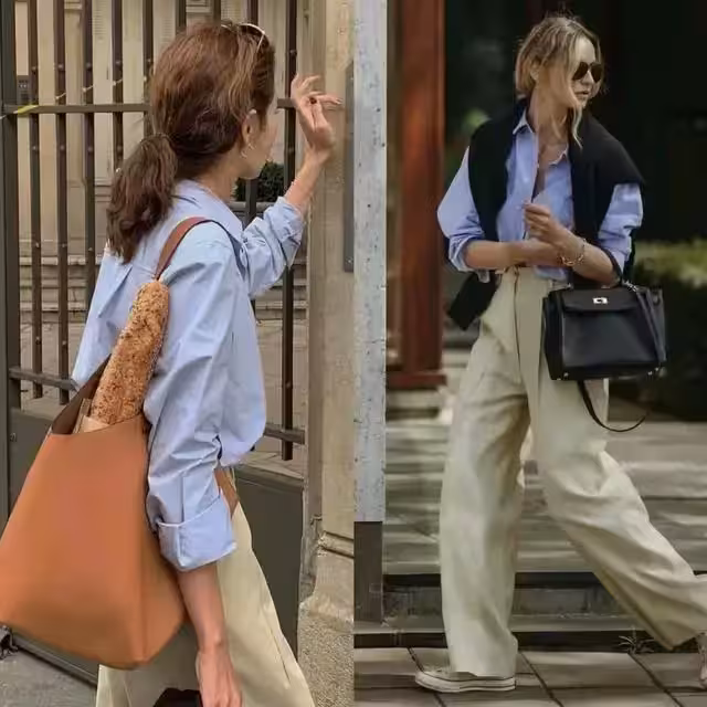 水藍色的襯衫搭配同色系的闊腿褲,配一款棕色的包包,增加了溫暖復古的氛圍,更時髦了。