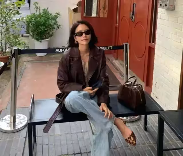 巧克力棕色的皮夾克,就有很濃郁的復古感,搭配懷舊的淺藍色牛仔褲,增加了青春的活力風格,整體的配色高級又時髦。