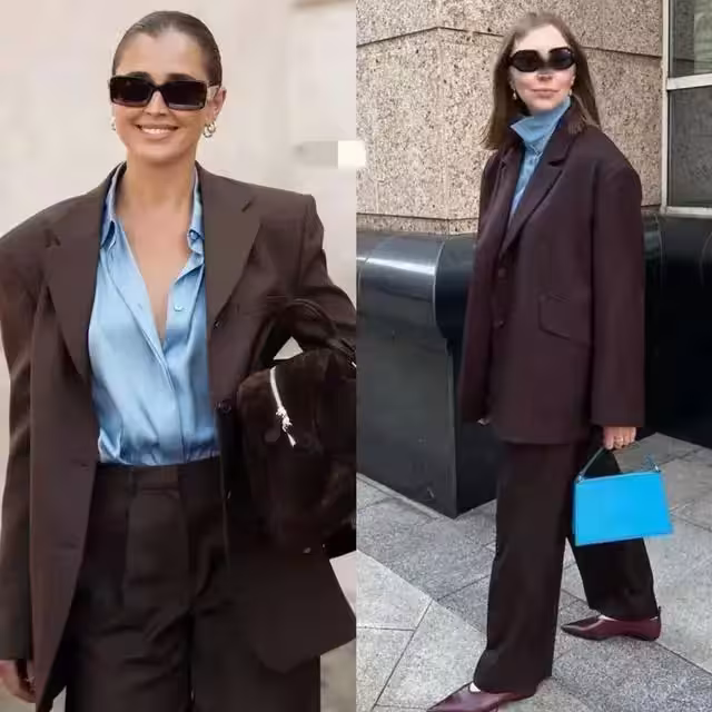對於職場女生來說,巧克力棕色的西裝沉穩大氣,帶著力量感,這時候可以搭配一件淺藍色的襯衫或是毛衣,立馬提升了精緻度,也讓原本略顯老氣的西服變得時髦起來。