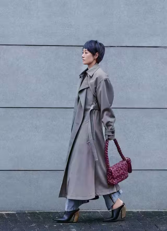 長款風衣在秋冬季流行度不低,鑒於衣長,個子高些的女生更容易駕馭,同時不擔心壓身高。此款風衣長度都快到腳踝了,大部分女性喜歡敞開穿,進而營造走路帶風的氛圍;長款灰色風衣十分百搭。再來看看內搭,馬伊琍選了一款黑色高領針織衫,天涼時,這種領口設計能有效保護頸部肌膚不受涼。