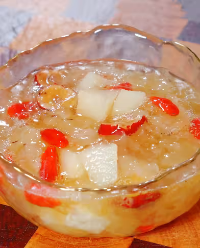 ②. 隔水慢燉2小時至銀耳膠質軟糯,出鍋前撒入枸杞。