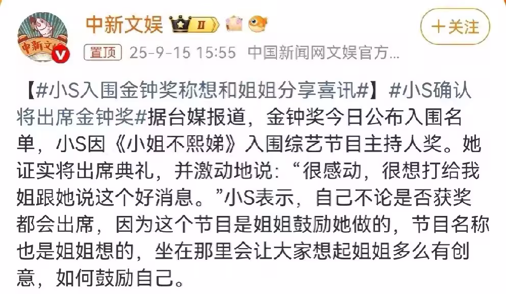 近日台媒爆金鐘獎入圍名單,小S因《小姐不熙娣》入圍金鐘獎節目主持人獎。小S很激動,說很想打電話給姐姐,告訴她這個好消息。並表示自己不論是否獲獎都會出席……
