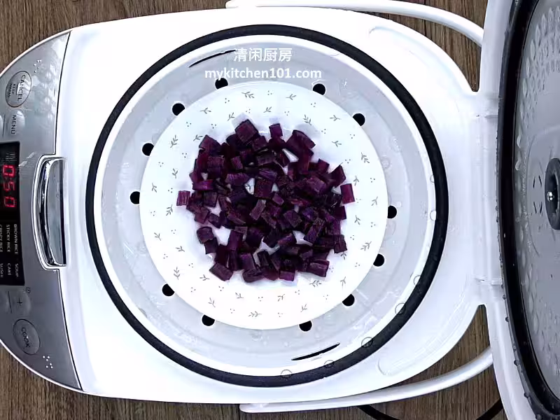 1 把50克紫薯丁蒸30分鐘直到非常軟。