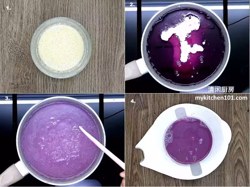1 *紫薯湯:把450克清水滾開,加入150克紫薯丁和2葉香蘭葉。再次加熱至滾開,以中小火煮15分鐘。取出280克紫薯湯。