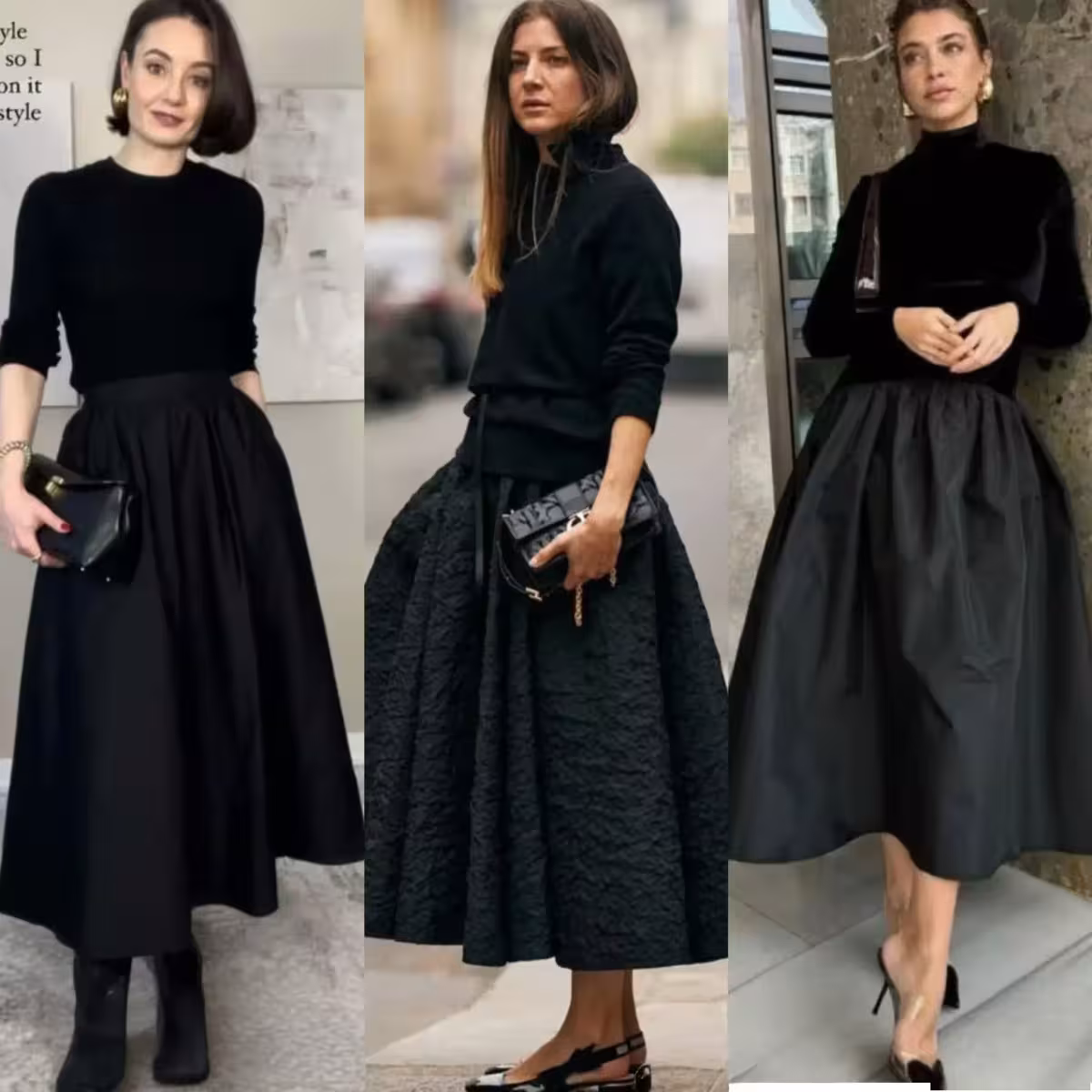 想要顯瘦又想要穿得高級,可以選擇一件修身的黑色毛衣搭配黑色傘裙,單一的黑色搭配顯瘦效果OK,上窄下寬的搭配方法又可以穿出優美的曲線感,既有女人味又很顯貴氣。