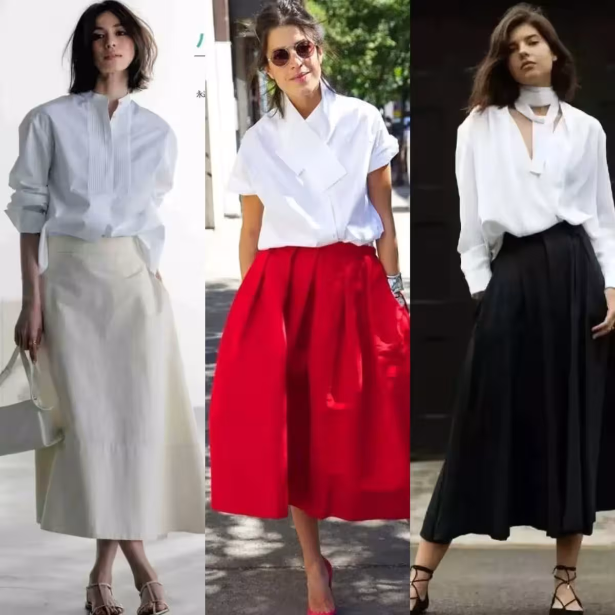 白色襯衫搭配番茄紅色傘裙,配色熱烈醒目又很清爽,白既有專業感,又不失女性柔美,讓人眼前一亮。