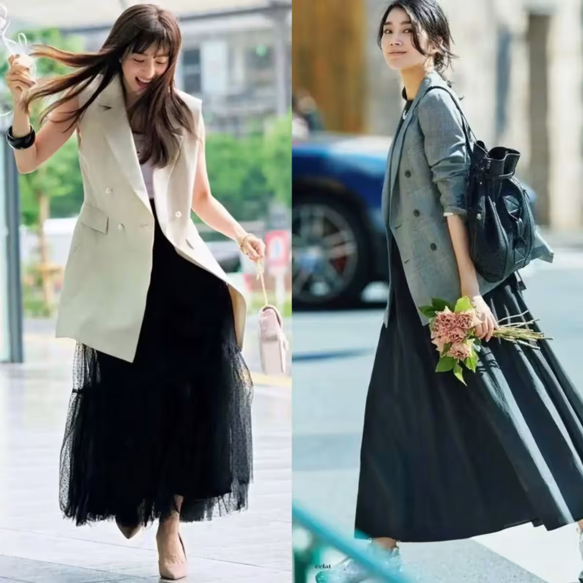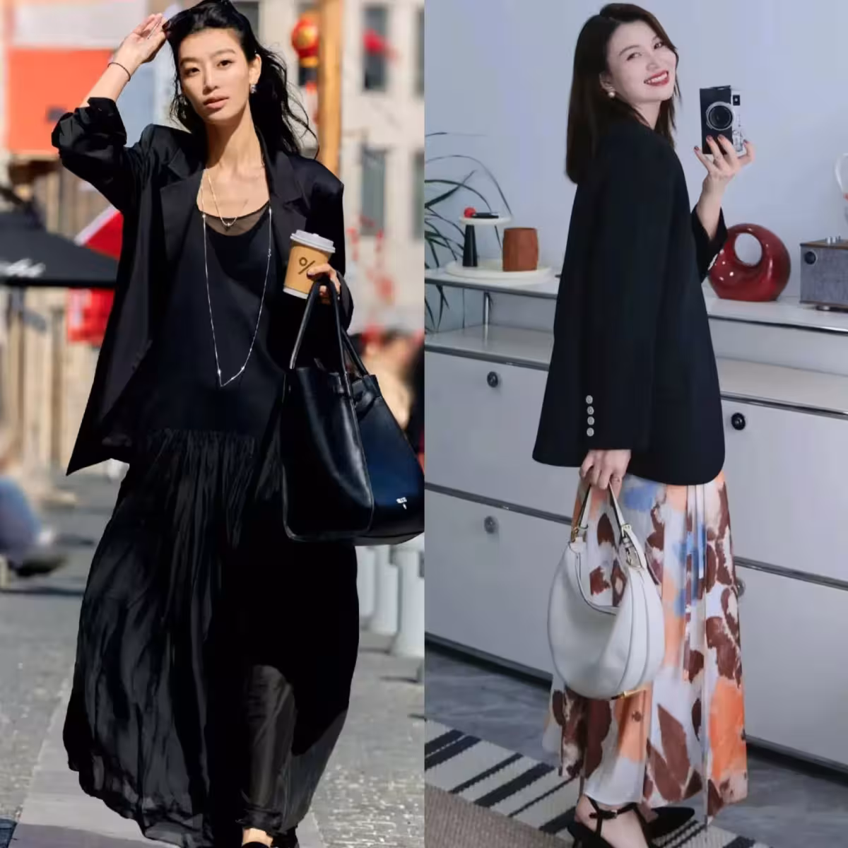日常通勤,可以選擇經典的黑白灰這類的西裝,搭配一條黑色傘裙,簡潔端莊中透著優雅知性的女人味,不強勢,也不柔弱,美得剛剛好。