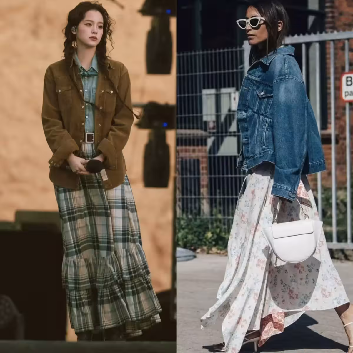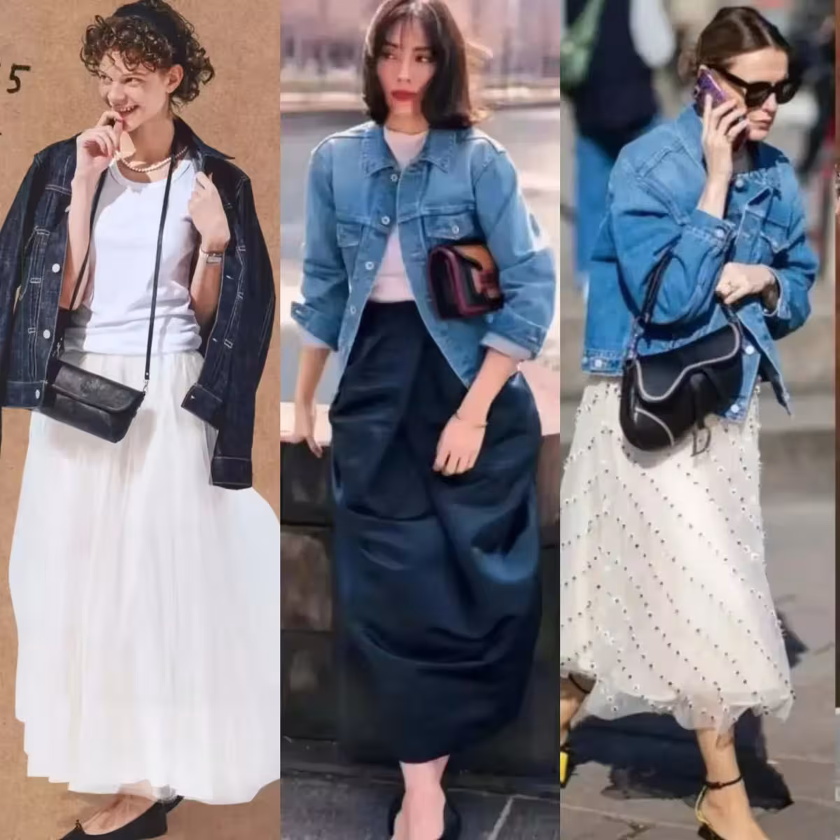 丹寧藍牛仔衣,帶著復古的有些粗糲感的意味,搭配黑色傘裙,有種隨性清新感,減齡好看。