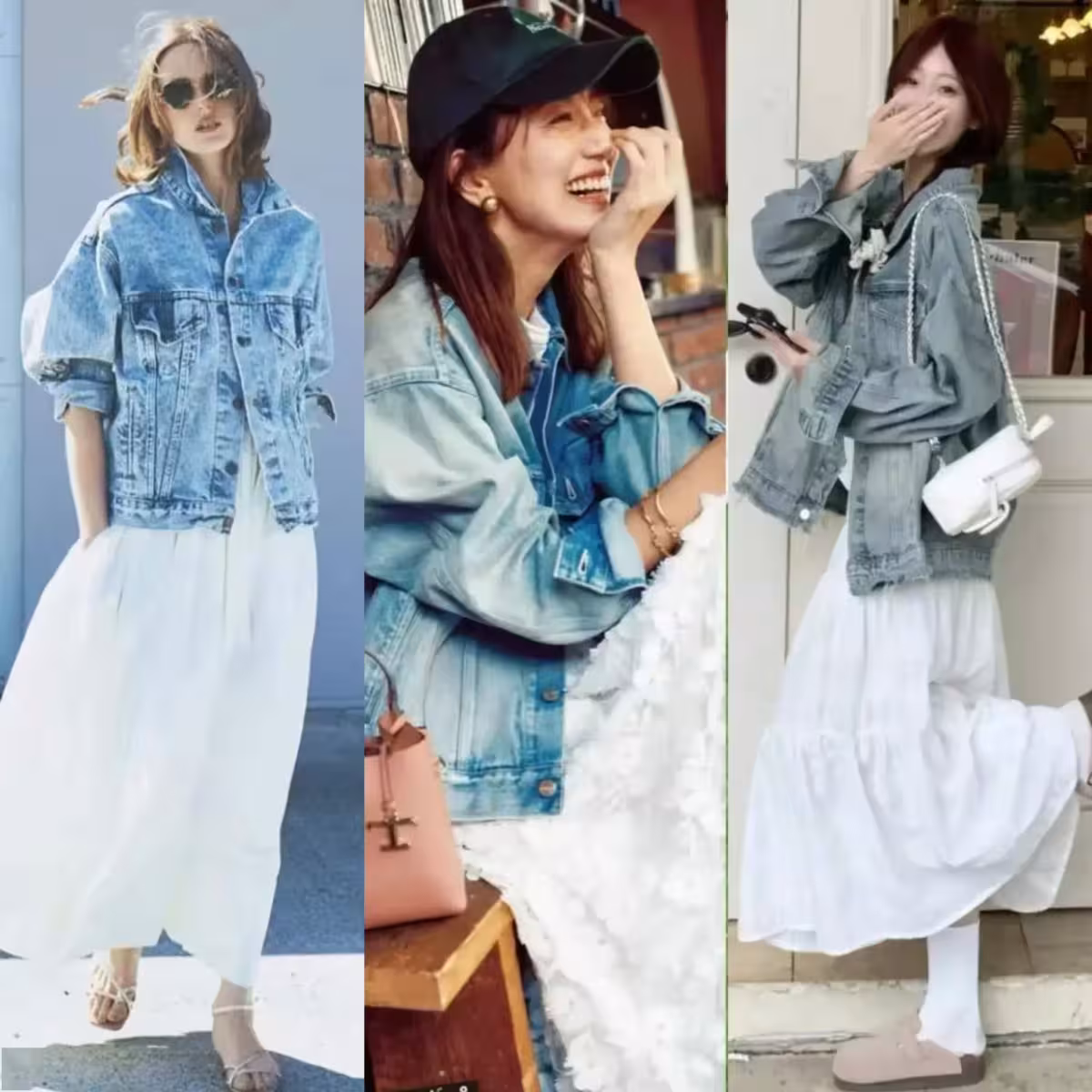 做舊色的牛仔衣,搭配白色傘裙,清新乾淨的配色,加上浪漫又硬朗的混搭風格,穿出了復古甜心的少女感。