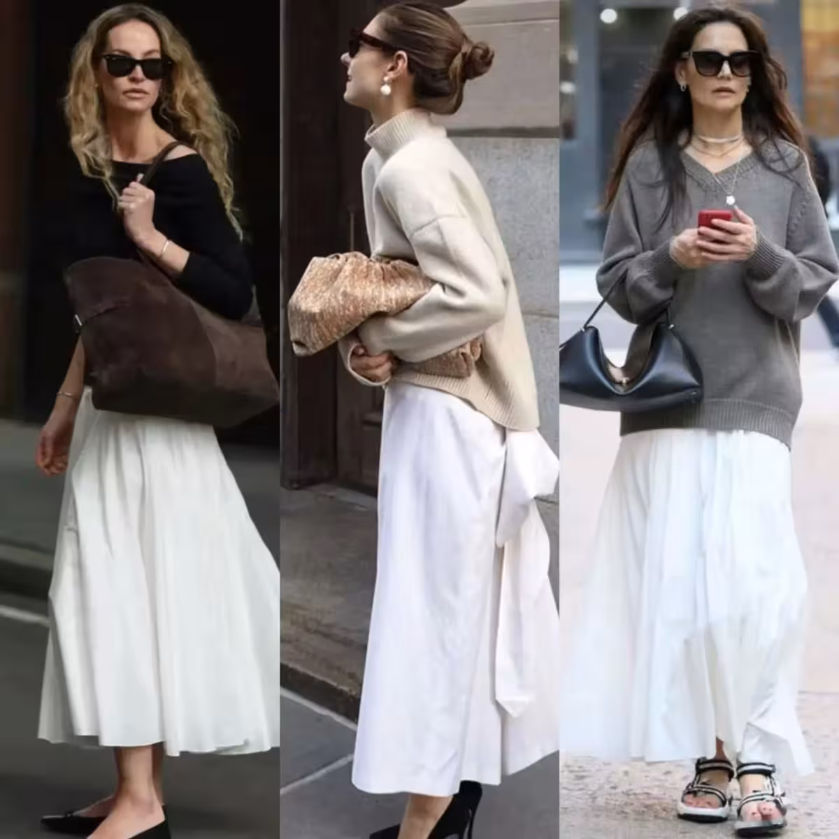如果你有一件冷峻感十足的廓形西裝,不妨選擇一條明媚的淺色傘裙,這樣的混搭減齡效果非常好。