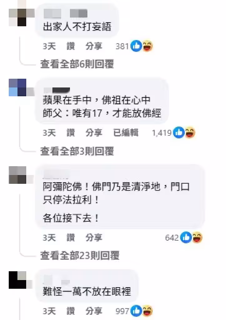 照片曝光後吸引1.8萬人點贊,許多網友留言表示「出家人不打妄語」、「蘋果在手中,佛祖在心中」、「阿彌陀佛!佛門乃是清凈地,門口只停法拉利!」、「蘋果也是素的喔」、「Pro度眾生」。這一幕也吸引了外媒注意,以「Monks spotted shopping at Taiwan Apple store during iPhone 17 release」為題報導,認為出家人排隊買手機與大眾對出家人「簡樸、無欲」的形象形成強烈對比。
