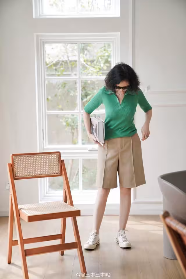 如果沒有什麼健康問題,也沒有美觀的問題,那麼到了夏季還是可以穿短褲的,建議選百慕達短褲,因為它真的非常好搭配,可以和前面的針織衫搭配一起,減齡效果也是非常棒的。如下圖中三木媽媽就是用白慕大短褲搭配的針織衫,真的好顯瘦,也看不出具體的年齡。