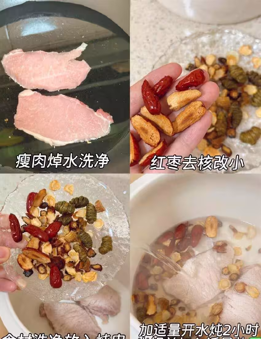 豬瘦肉洗凈後焯水,撈出洗凈;紅棗去核改小。