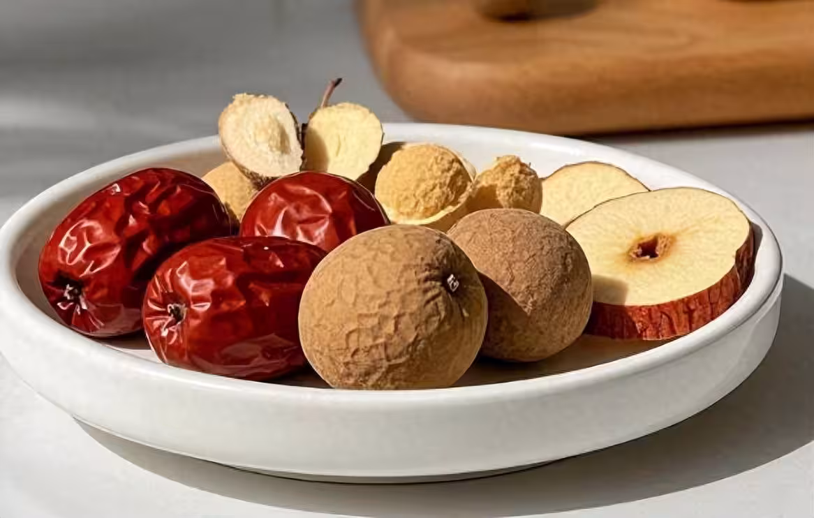 紅棗 味甘、性溫,可 補中益氣、養血安神 ;氣為血之帥,血為氣之母。 黃耆 味甘,性微溫,可 健脾補中、昇陽舉陷、益衛固表 ,從根源推動氣血的化生; 蘋果 生津止渴、健脾胃,還可防止上述三味藥溫燥太過。