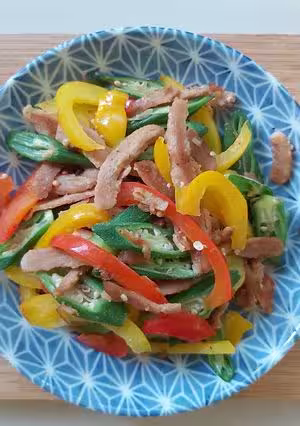 新肉絲泡水解凍。用鹽巴搓去秋葵表面的絨毛,再用刨刀去除蒂頭部分的粗纖維,切成斜片。紅黃椒切粗絲備用