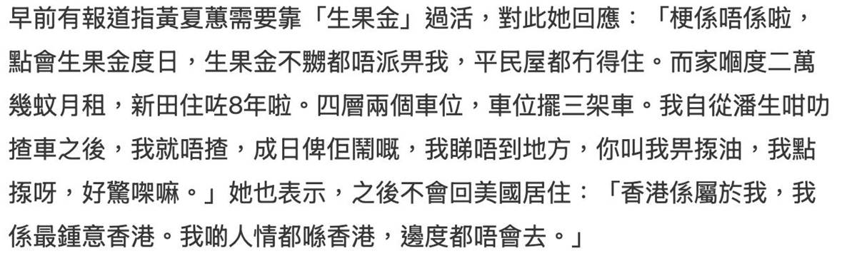 黃夏蕙這些年來的生活一直備受關注,早前她自曝住進了僅15平方米的過渡屋,一度引發外界的關注,還讓外界覺得她被子女棄養,生活悽慘。