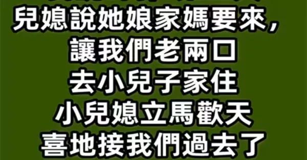 我存了60萬,大兒媳問我存了多少錢,我說6萬,第二天兒媳說她娘家媽要來,讓我們老兩口去小兒子家住,小兒媳立馬歡天喜地接我們過去了